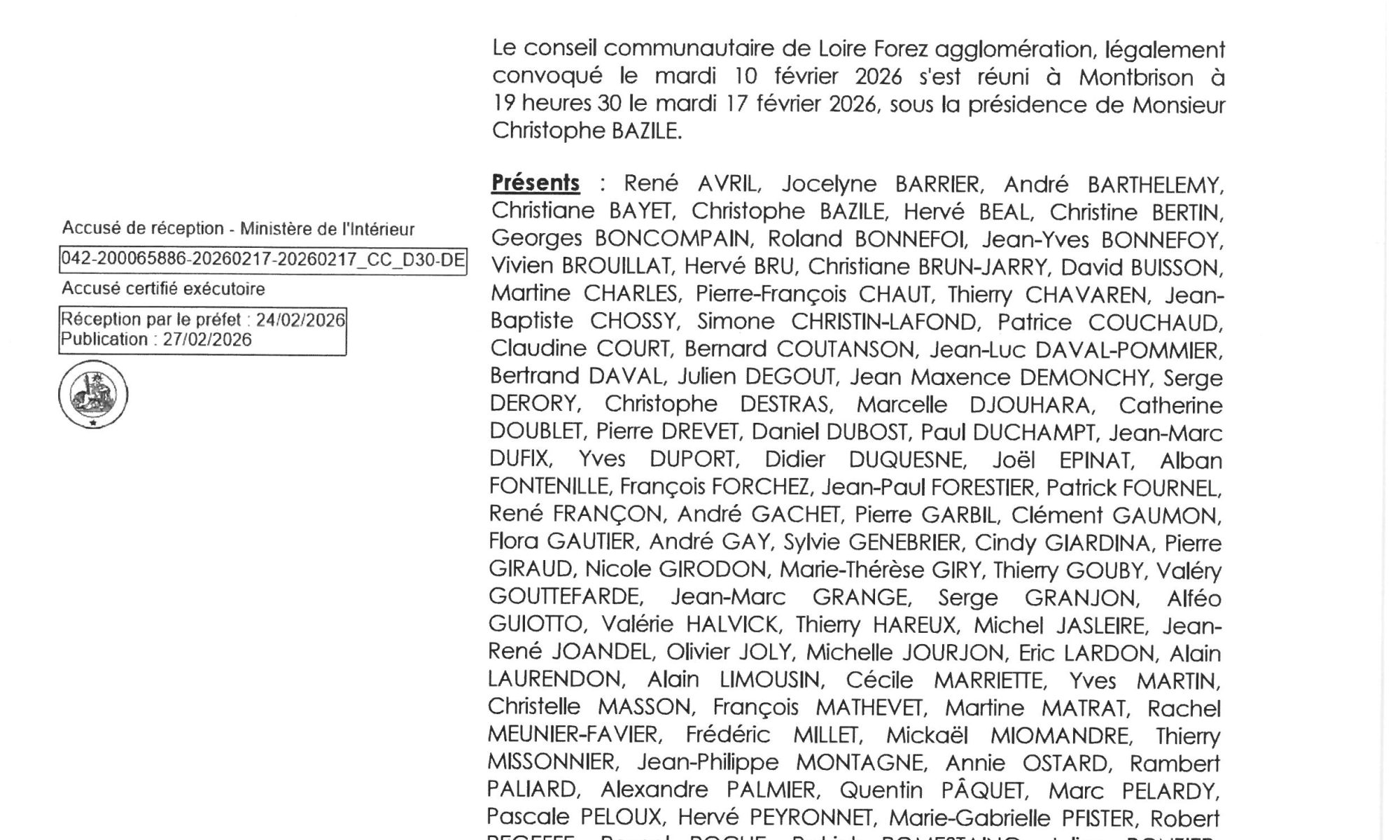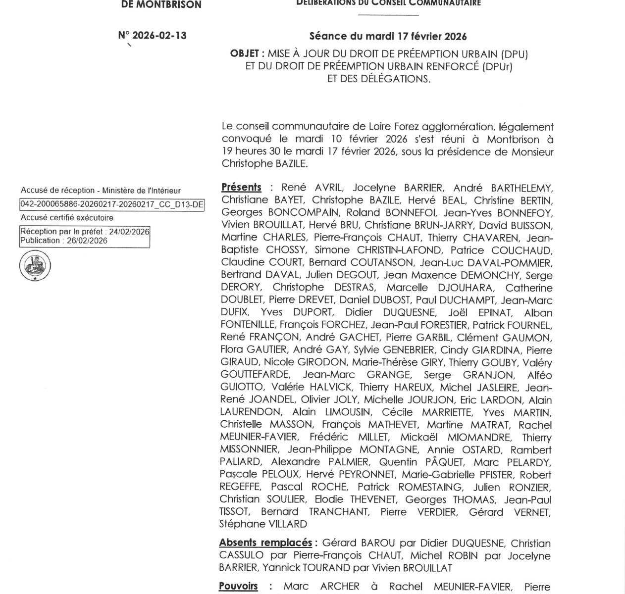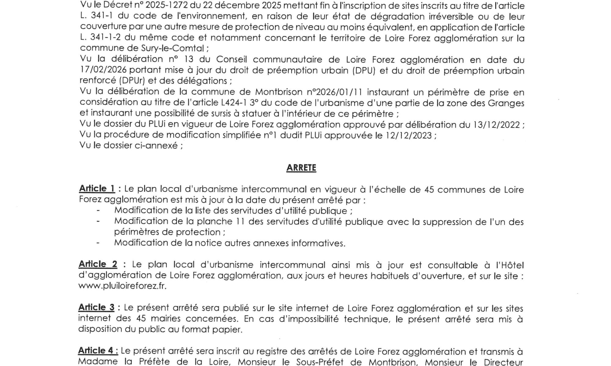 Délibération n°2026 02 30 relative au bilan de la concertation de la modification n°1 du Plan Local d’Urbanisme intercommunal à 45 communes, prise par le conseil communautaire du 17 février 2026.