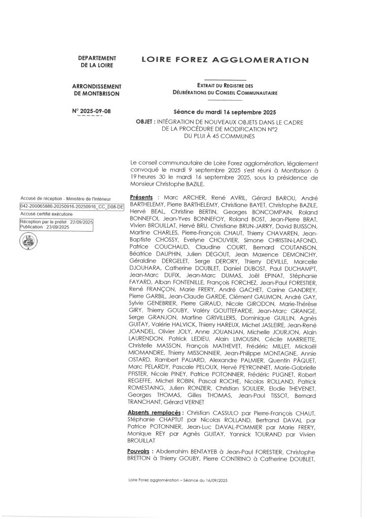 Délibération N°2025 09 08 INTÉGRATION DE NOUVEAUX OBJETS DANS LE CADRE DE LA PROCÉDURE DE MODIFICATION N°2 DU PLUI À 45 COMMUNES